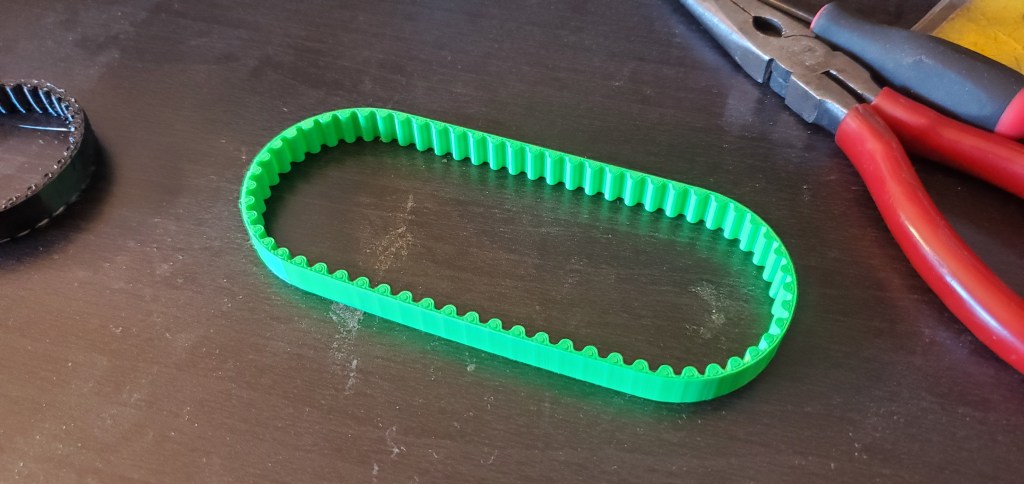 After some efforts to tune model and print settings, I was able to emulate the timing belts in TPU and cast wheels to prototype. By adding these to printed side rails and a printed shaft it reached “pretend-o-bot” status quickly. Though it took a few extra days from building, this short test confirmed the increased functionality over the regular 2WD and outrigger combination last year.