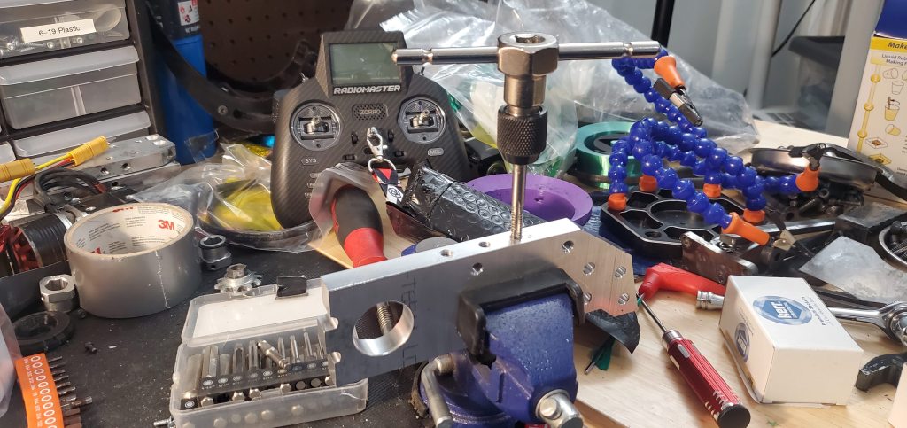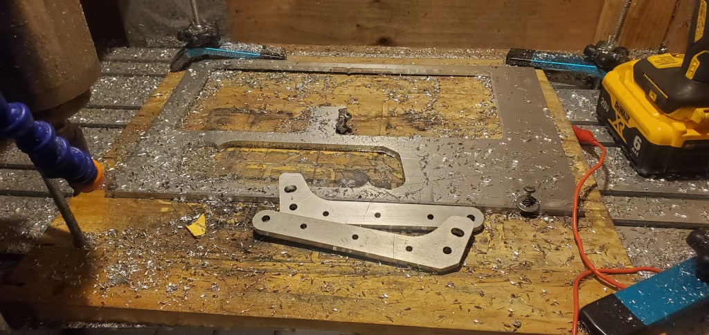 The order from SendCutSend was caught in the mail and didn’t arrive with the 6061 aluminum and AR500 steel that would form the outrigger fork. After a quick trip to the local metal store and waiting for a day above freezing to use the CNC router, the outriggers’ primary parts were machined out.