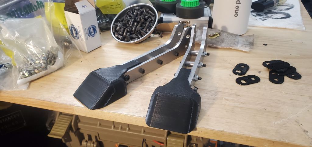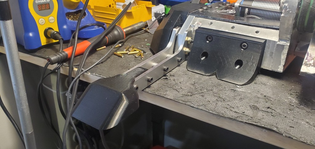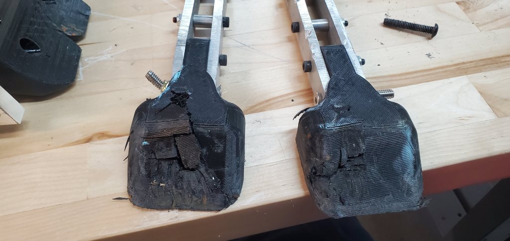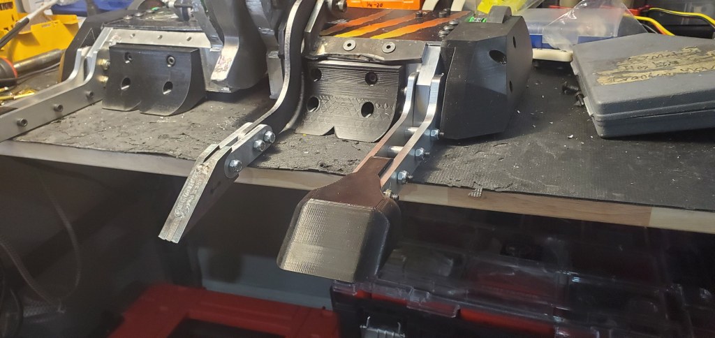 To replace the AR500 parts, TPU pieces were printed with 6 walls, 15% infill and the overall size of the tips increased. The larger tips should do better contacting some portion of the other robot to “tie” during an interaction. While it is not nearly as functional for deflecting direct weapon impacts, this will have to suffice given the logistical problems.