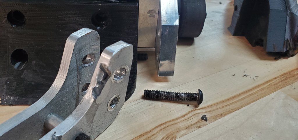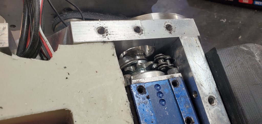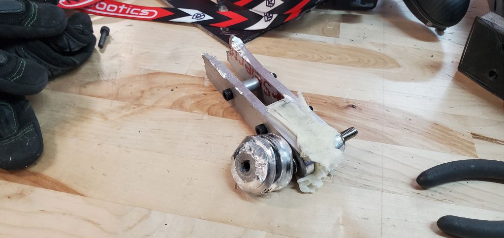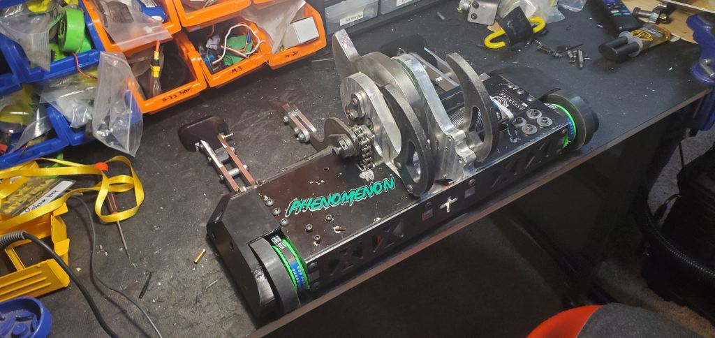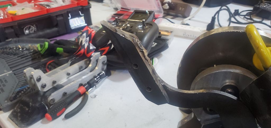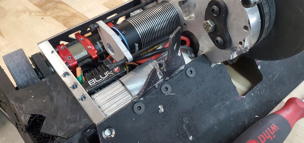 This fight was also short with FSH catching an edge on the baseplate and curling it down enough for the robot to be high-centered. Outside of that there was certainly signs of wear but nothing catastrophic. The greatest surprise was the lifter support bearing exploding and the chain breaking. The goal was the separate outboard lifter mount would increase reliability but the chain and bearing failing show it still isn’t safe. This will have to be reevaluated in the future.