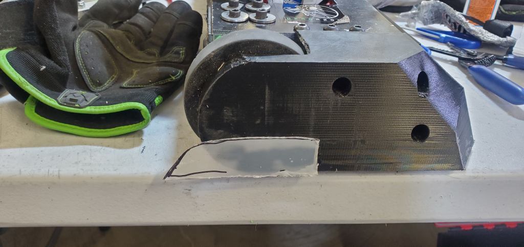 Maccabot was the robot I was most worried to draw. Due to the issues Phenomenon had with drums and beater bars at World Champs the outrigger update was going to be the answer. Since the mail took the steel away, the only outrigger option was to run it with the TPU tips which would be mulched by Maccabot’s weapon. Therefore, the plan was to remove the outriggers entirely and invite direct weapon hits. Since the outriggers also weighed down the front of the robot to avoid wheelies, little polycarbonate pieces were glued to the outer guards. These were just stiff enough to keep the robot from rolling backwards but flexible enough that they did not limit self-righting.