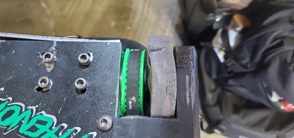 In the fights I also found the TPU pulleys on the drive motor wore out in that match which is why the robot dragged on one side. Its a good mental note that TPU pulleys are considered consumable for roughly one full match. These can be easily switched to Nylon in the future.