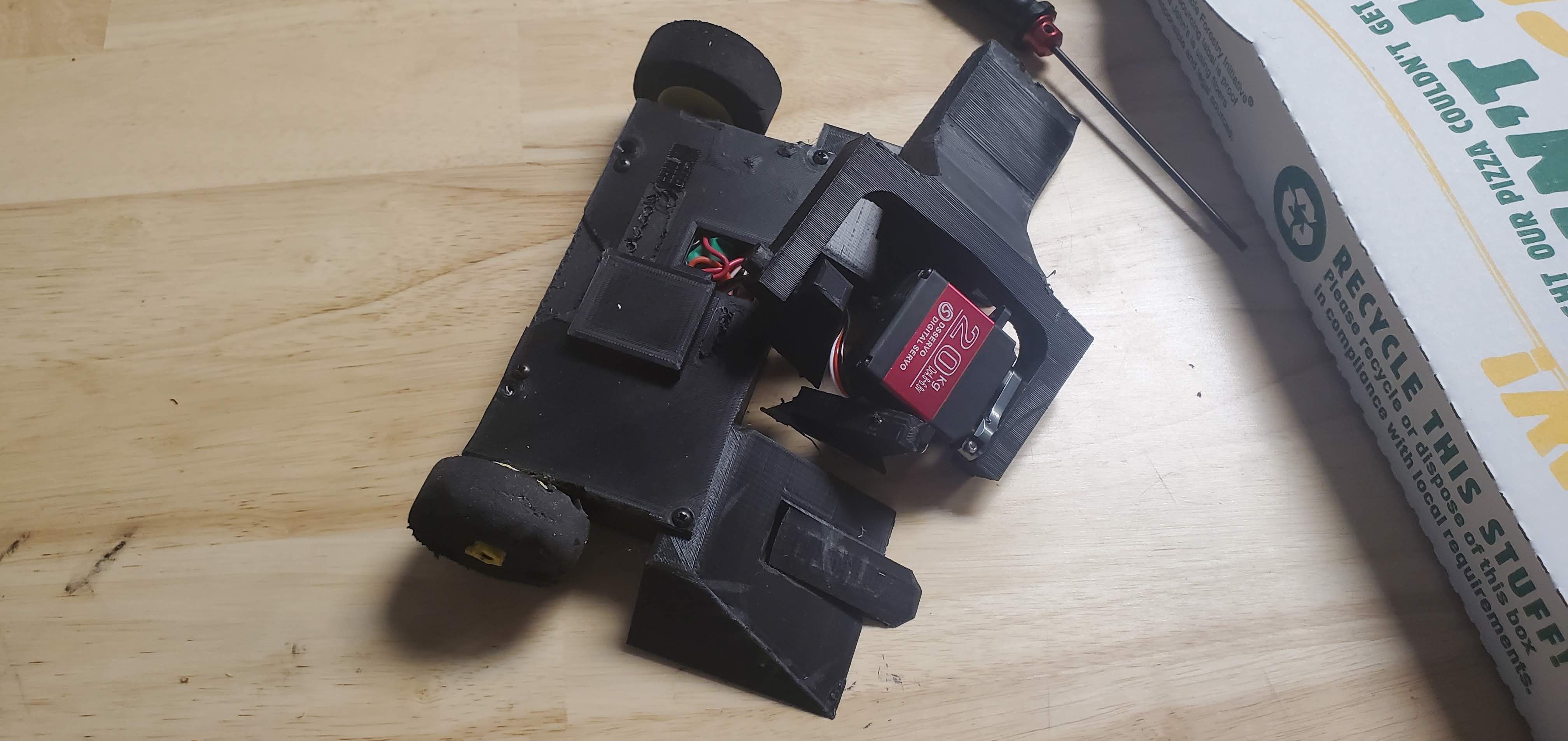For the July Bayside event, Kerfuffle was reassembled and entered into the division. While its usual smothering technique was effective, the lifting system was once again severed from the bot resulting in a loss. The arm was reattached best as possible and the arm sanded down as best as possible to adjust, but no such luck. The design is effective, but a better way to support the arm is necessary.