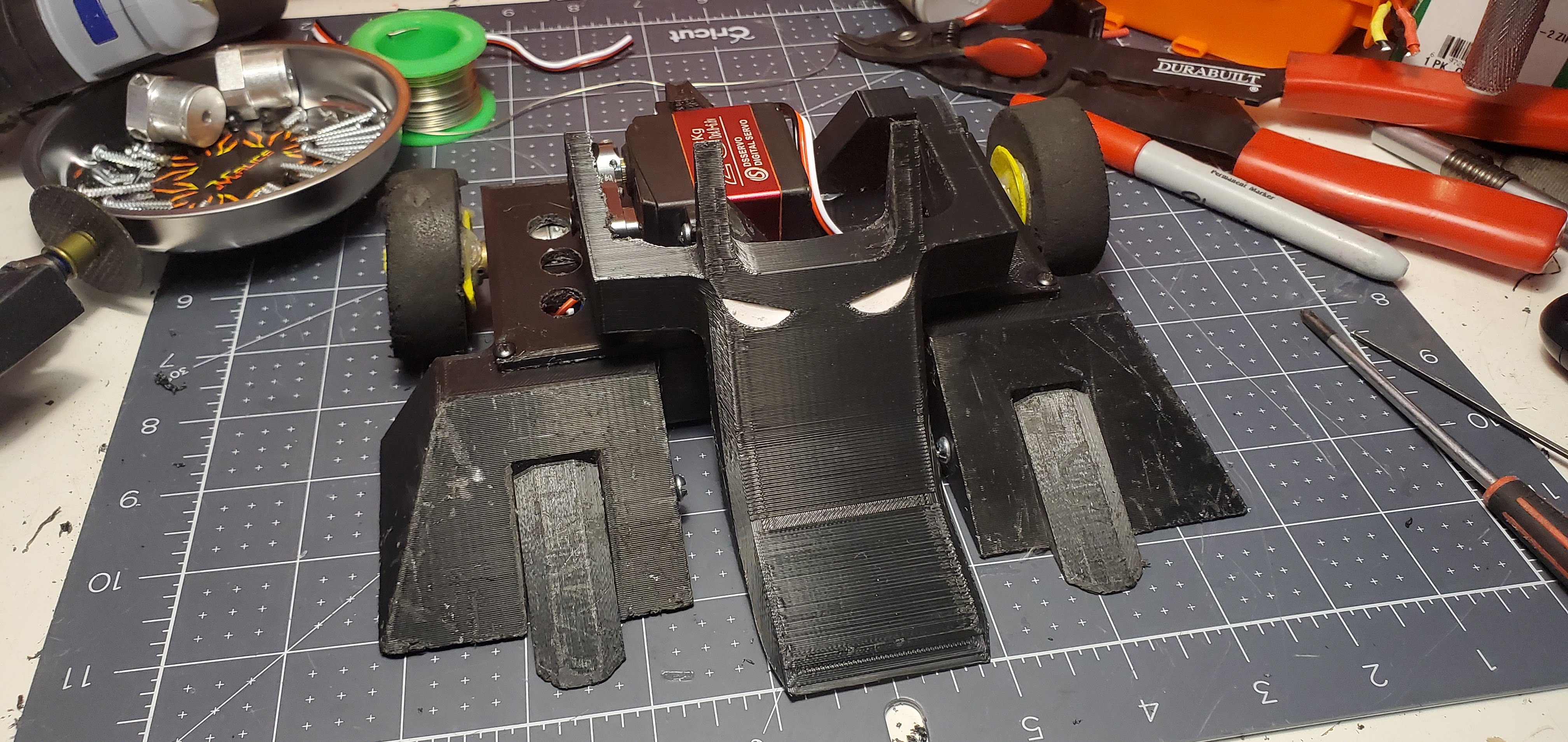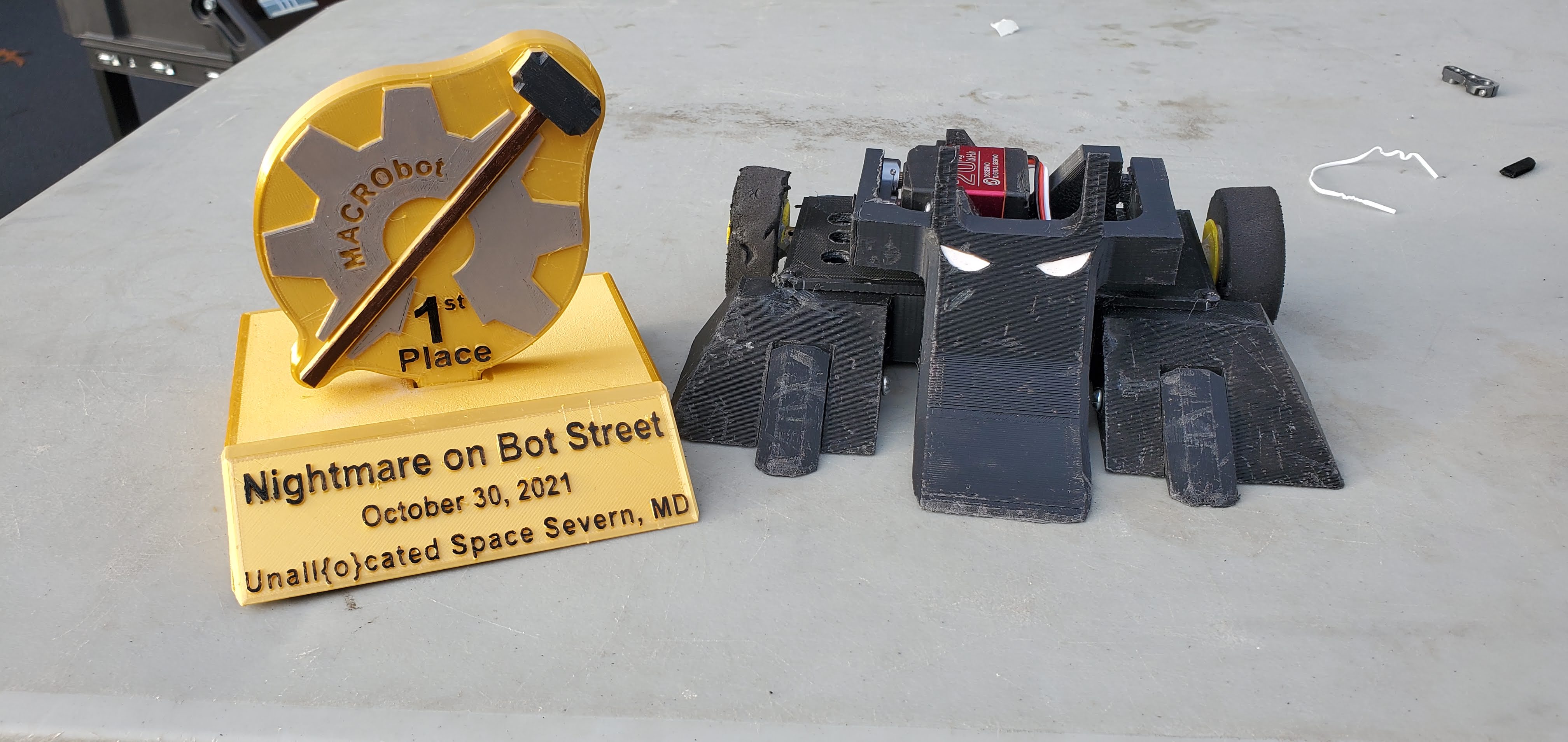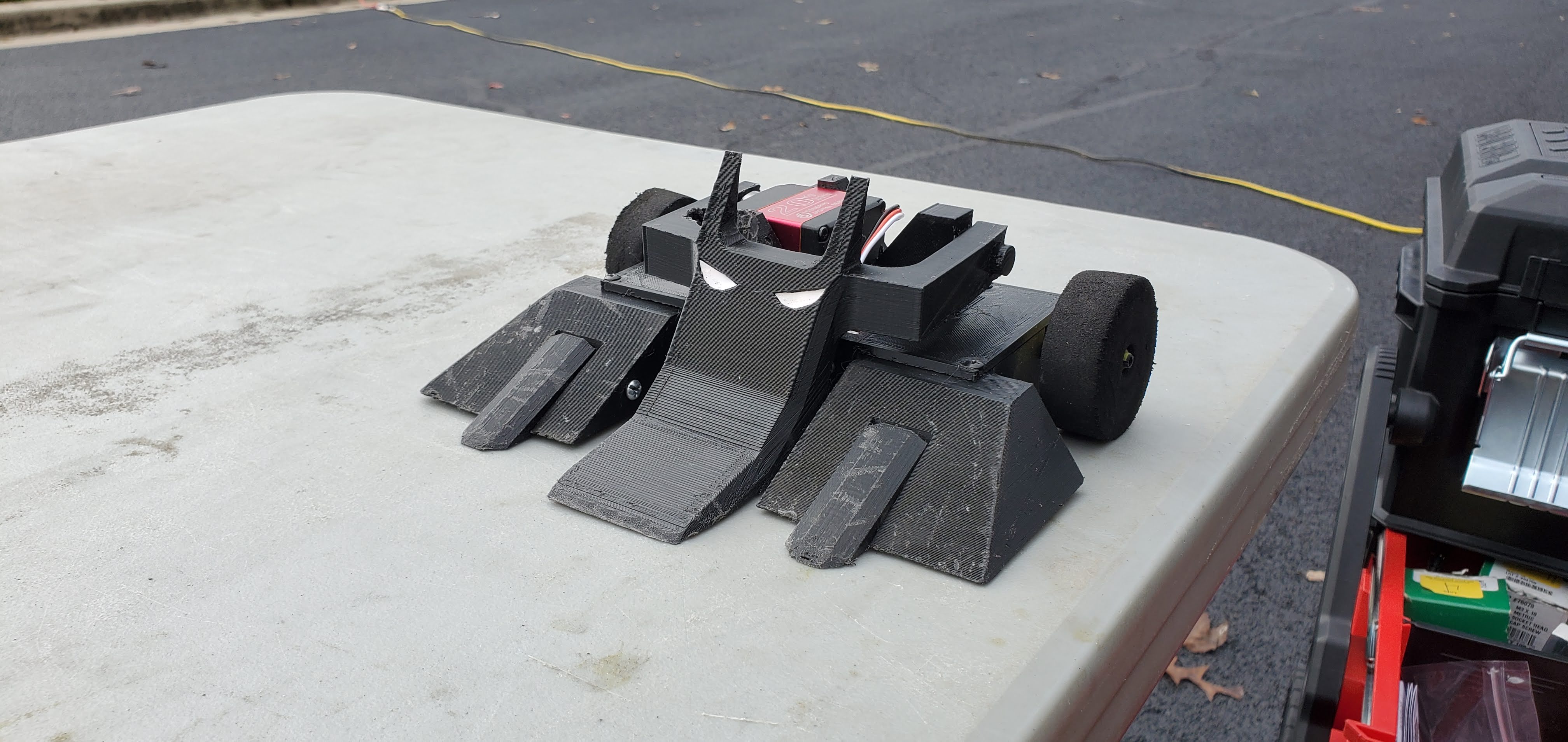 For the October event Kerfuffle was modeled after Batman as part of Halloween decorations. To ensure this new look doesn’t come off, the lifting piece was made into two pieces. The intention was to glue the pieces together and to trust the adhesion strength of the hot glue to keep the pieces together instead of the adhesion from the layer lines of the print. With both ideas at play, Kerfuffle ascended to another top finish! I really like the ability to style that comes with 3D printing so I will both keep this shape on future robot designs and add some to other machines too!