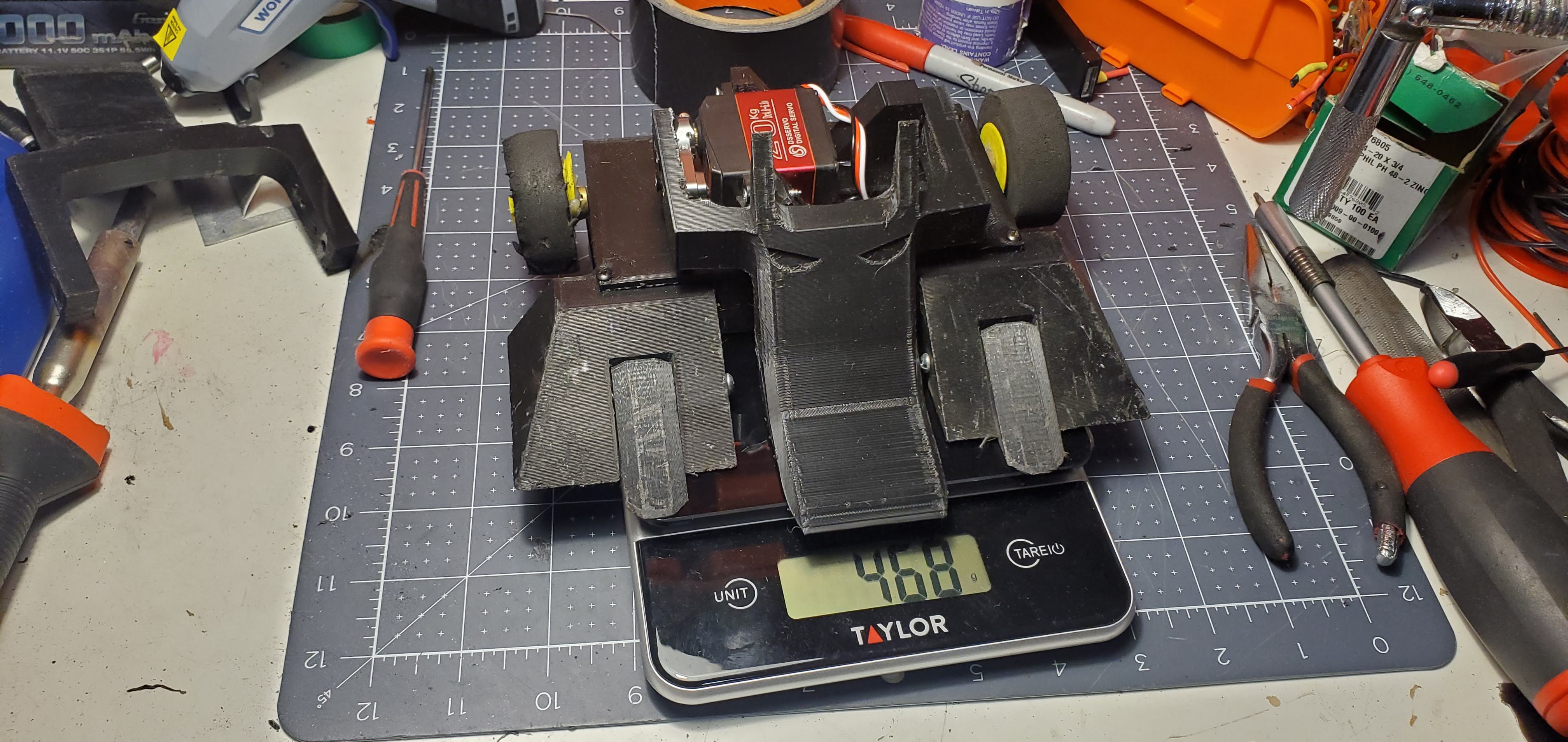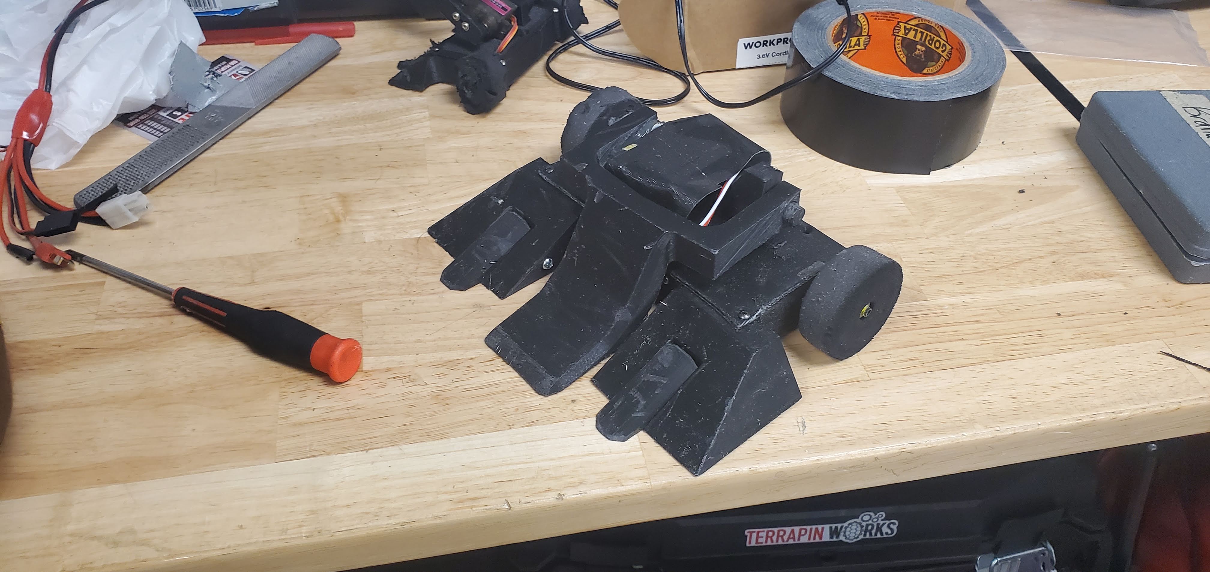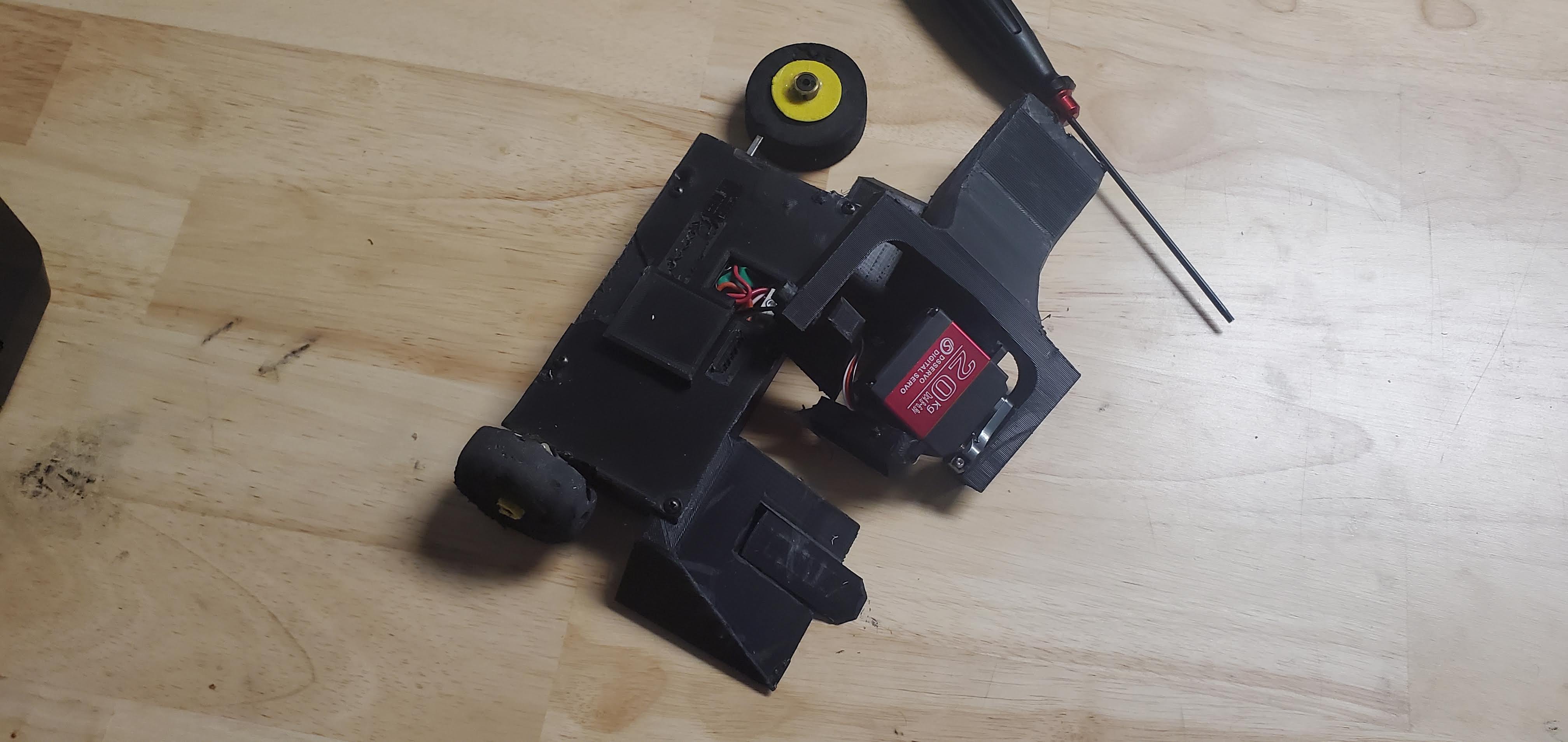 For the October event Kerfuffle was modeled after Batman as part of Halloween decorations. To ensure this new look doesn’t come off, the lifting piece was made into two pieces. The intention was to glue the pieces together and to trust the adhesion strength of the hot glue to keep the pieces together instead of the adhesion from the layer lines of the print. With both ideas at play, Kerfuffle ascended to another top finish! I really like the ability to style that comes with 3D printing so I will both keep this shape on future robot designs and add some to other machines too!